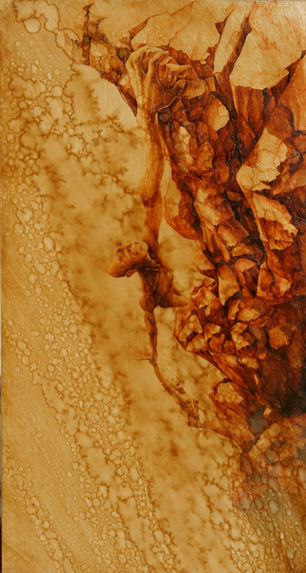 Dans un format tout en hauteur et selon une palette limitée à quelques tons de verts, bruns et ocres, le peintre a choisi de représenter une chaîne très particulière, une chaîne humaine. Le long d’une ligne courbe verticale, se tenant les uns aux autres de toutes les façons possibles, des hommes et des femmes nus semblent lutter pour s’extraire de la matière dont ils surgissent.En effet, le fond abstrait du tableau, furieux jaillissement, évoque une éruption volcanique dont le magma en fusion donnerait naissance à la vie. Ainsi sommes nous confrontés à ce qui pourrait s’apparenter à une véritable naissance de l’Humanité, venue d’obscurs tréfonds pour émerger à la lumière. Mais nous n’assistons pas seulement ici au miracle profane de la matière inerte prenant vie mais aussi à celui de l’esprit. Dans un élan primordial vertical, cette chaîne de chair s’apparente ainsi à une échelle spirituelle où ensemble, ici, dans un effort commun et solidaire, chacun et tous s’élèvent