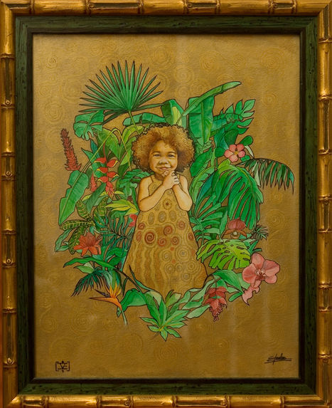 Ce tableau commémoratif offre une interprétation poignante de quatre attitudes face aux atrocités infligée par l’Homme à l’Homme. Sous un ciel rouge et dans une mer de sang, se dessinent quatre silhouettes incarnant les émotions liées au déracinement et à la déshumanisation. Au premier plan à gauche, là où les vagues viennent mourir en laissant leur écume, se tient une femme, à genoux, implorant le ciel, dernier recours face à l’absurde, ultime témoin de l’implacable injustice. Au centre, la liberté s’acquiert dans la mort, ultime échappatoire à l’oppression. Enfin, le dernier se débat contre un oppresseur invisible qui le tient au bout d’une chaîne, illustrant ainsi le cycle sans fin de l’exploitation de l’homme par l’homme. Cette œuvre est présentée au centre d’une déchirure de papier noir, sur lequel s’enchaînent des mots évocateurs : servitude, subordination, sujétion, torture, hégémonie, domination, traite, humiliation, asservissement, aliénation, destruction, anéantissement, élimination, annihilation, éradication, génocide, mépris, abaissement, dévalorisation, démolition, dégradation, rejet, extermination, cruauté, emprisonnement, exploitation... Autant de termes qui témoignent des exactions perpétrées par l’Homme contre l’Homme.