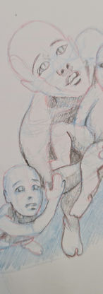 L’impact sur le spectateur en est d’autant plus fort qu’en quelques traits le destin tragique d’une mère et de ses deux enfants se dessine : coincés sur un éperon rocheux à peine assez grands pour qu’ils s’y tiennent, un gouffre sans fond s’ouvre sous leurs pieds, tandis qu’au dessus d’eux, rien n’indique un possible échappatoire ! La vue en contre-plongée choisie par l’artiste écrase un peu plus ces êtres dont la vulnérabilité extrême est rendue plus accablante encore. Le regard fixe, le visage tendu vers ce que l’on imagine être le rebord de la falaise, la femme et l’enfant semblent comme pétrifiés. Pierres parmi les pierres, dans l’abandon total où ils se trouvent, quelle autre issue que la mort les attend ? Vision terrible, mais qui malheureusement peut faire écho à tant de destins semblables autour de nous...